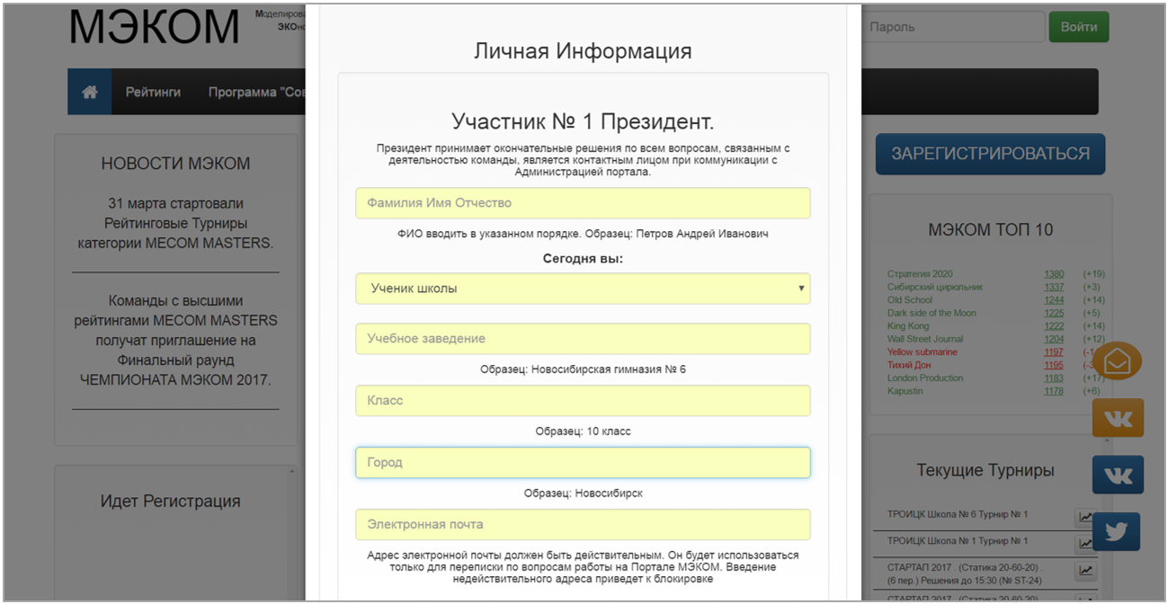 Адреса электронной почты должны быть действительными. Они будут использоваться только для переписки по вопросам работы на Портале МЭКОМ. Введение недействительного адреса ведет к блокировке.