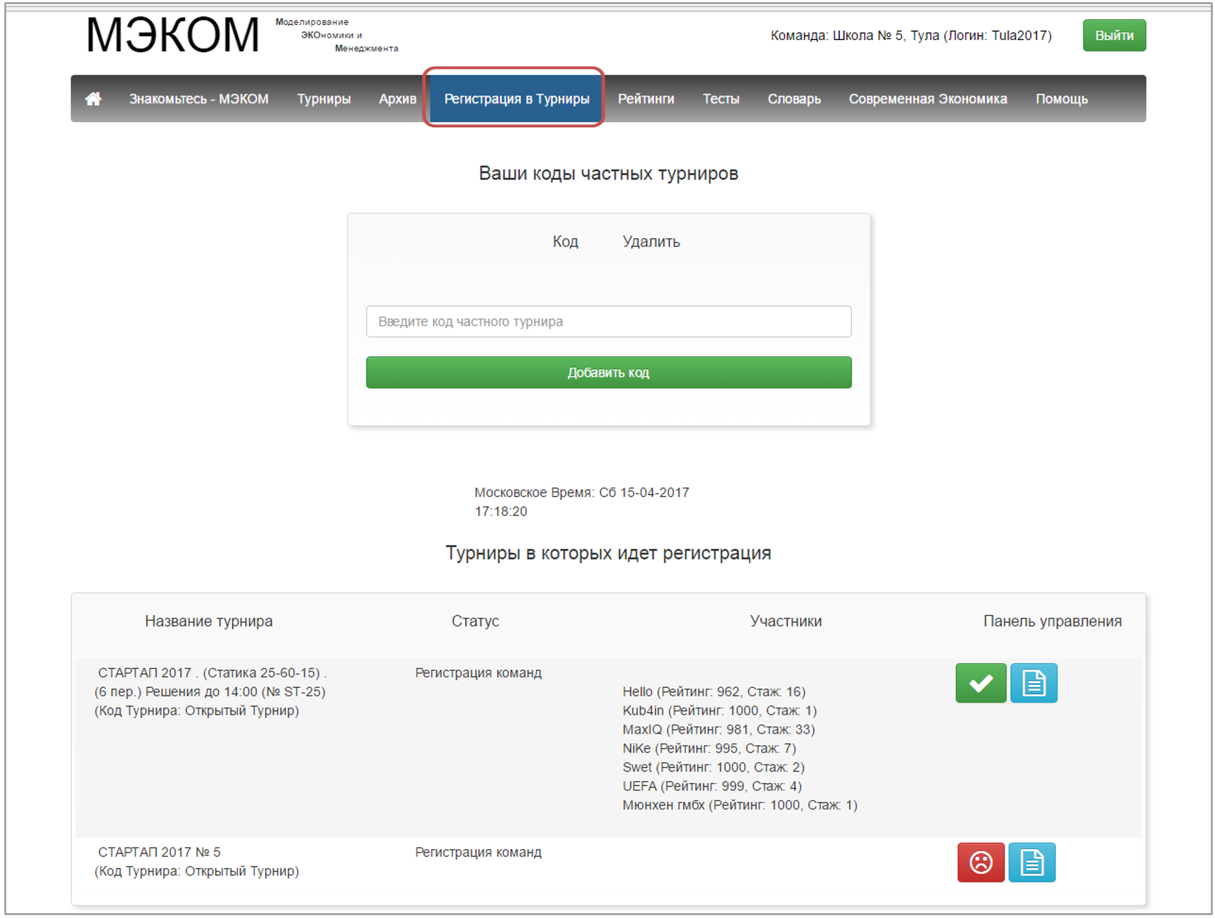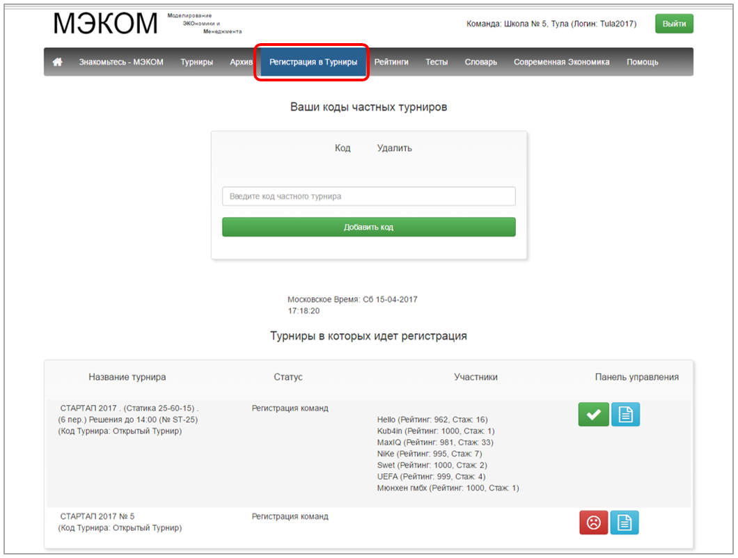 Введите код, который Вы получили от Организатора турнира и нажмите кнопку «Добавить код»