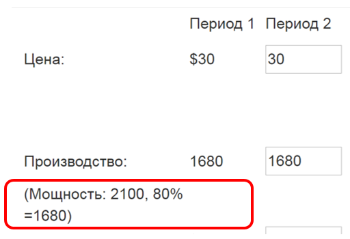По результатам решений, принятых в предыдущих периодах, у каждой Фирмы формируется Мощность фабрики – максимальное количество продукции, которое может быть произведено Фирмой в данном периоде.