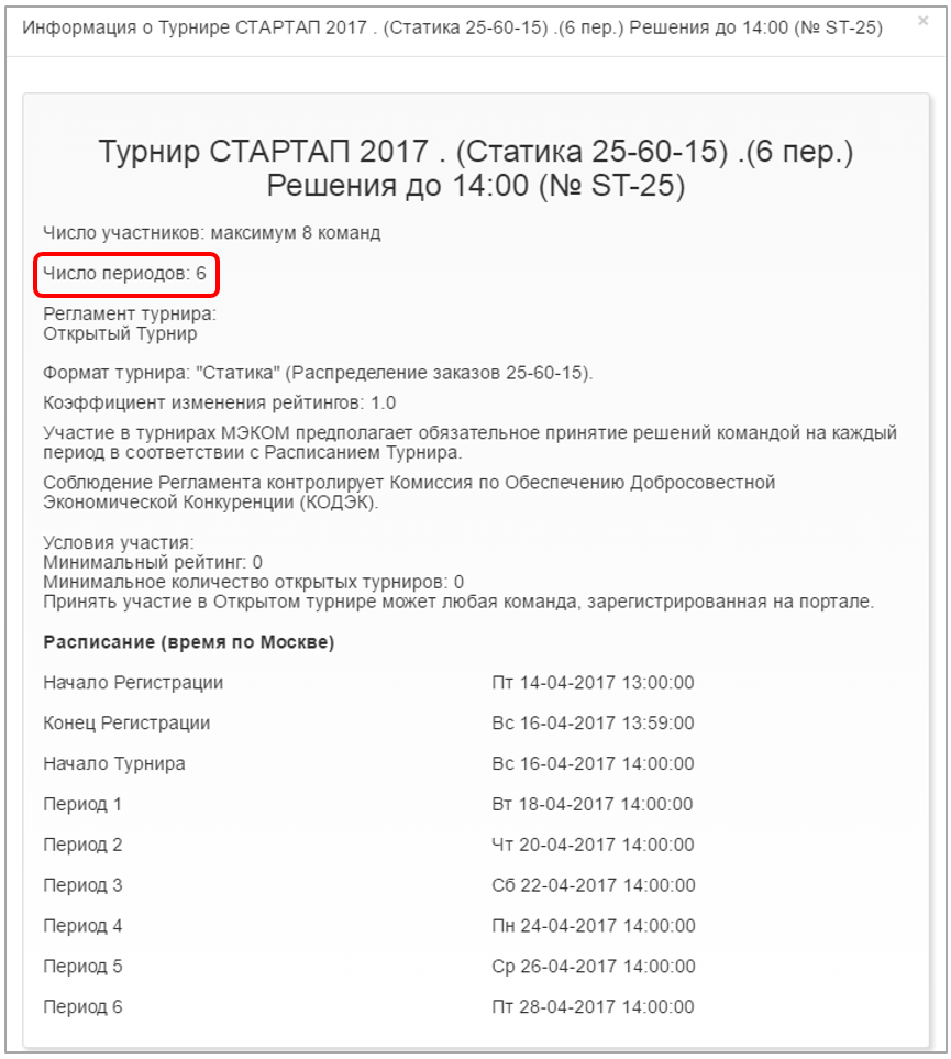 Количество периодов, которое будет сыграно в турнире, определяется Организатором. Информацию о количестве периодов выводится в Турнир-Инфо.